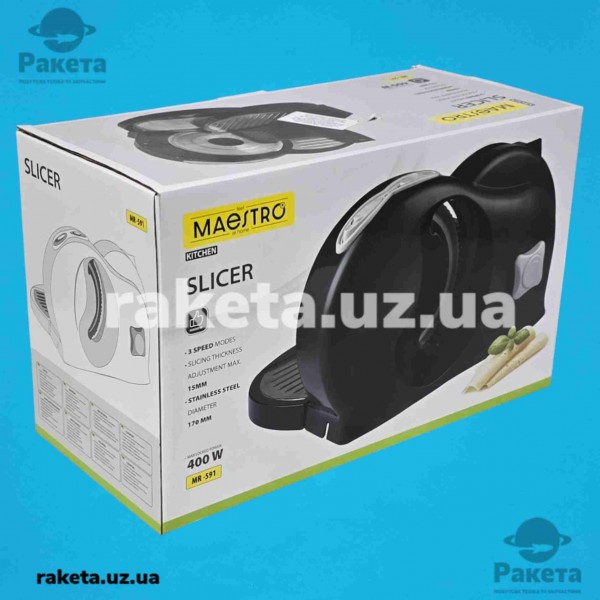 Слайсер Maestro MR 591 150-400 Вт, діаметр леза з нержавіючої сталі 170 мм, 3 швидкісних режима, регулювання товщини нарізки до 15 мм