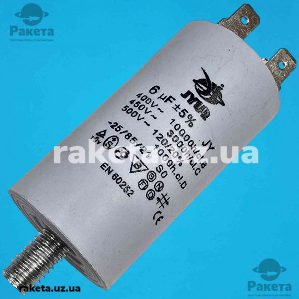 Конденсатор JYUL CBB-60M 6 мкф - 450 VAC болт + клеми (30*57 мм)
